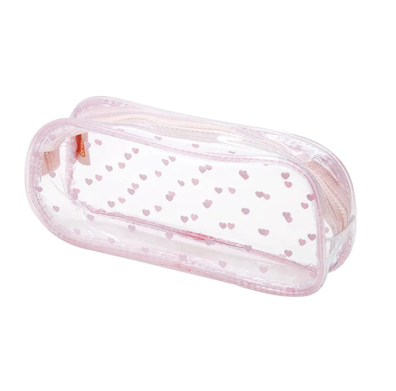 Estojo transparente com estampa fofa de corações. Com espaço para muitas canetas e seus itens essenciais de material escolar!